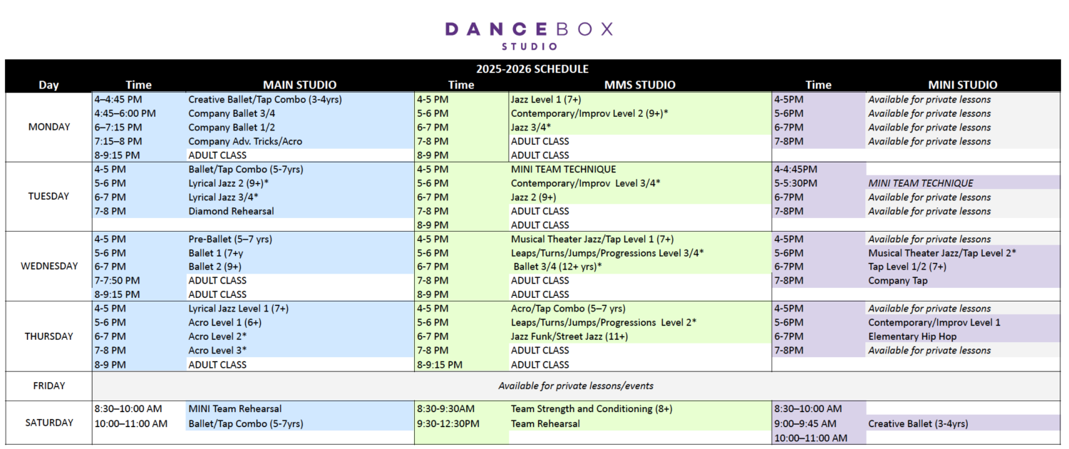 If you have any questions, please contact us! We love helping families understand their dance education options, and what you can expect at Dancebox. No matter the level you’re looking for, we offer dance classes from beginner to intermediate/advanced levels in various genres of dance for students ages 3+. Registration is ongoing throughout the season and we accept new students through April 15th.
